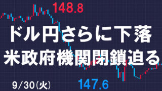 FX 米政府機関閉鎖なのか 火曜のドル円は前日の下げトレンドが継続し、147.6円まで強く下落していきました。 ここにきて150円から明確に反発した形ですが、月末ということで調整の売りもかなり入っているものと思われます。 ドル円 -9.7PIPS -4... 2025.10.01 FX