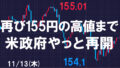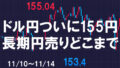 来週以降に155円を超えてくるかもしれませんが、ここからさらに上げる材料が乏しい感じもしますので、節目の数字ということで抵抗線となる可能性もあるでしょう。