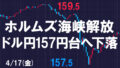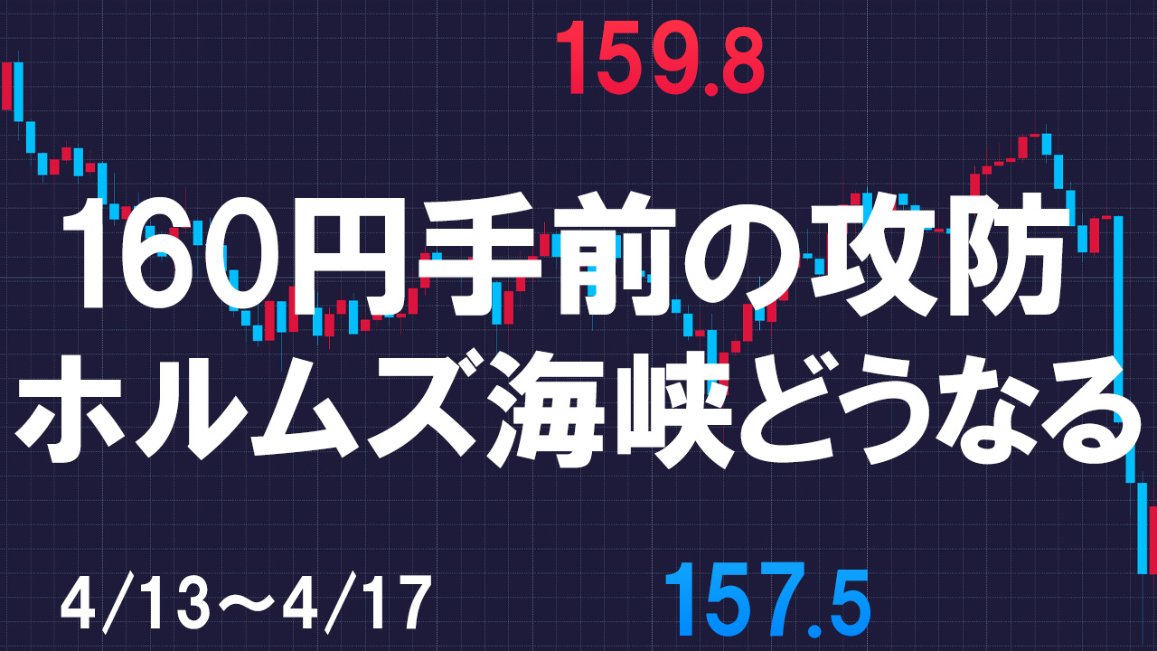 先週のドル円はやはりイラン情勢で値動きが出る相場でしたが、金曜にホルムズ海峡解放の報道で一気に157.5円まで下落しました。
