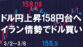 158円で止まって一週間が終了しましたが、イラン情勢が長期化すれば原油高やドル買いの流れはそう簡単には止まらないかもしれません。