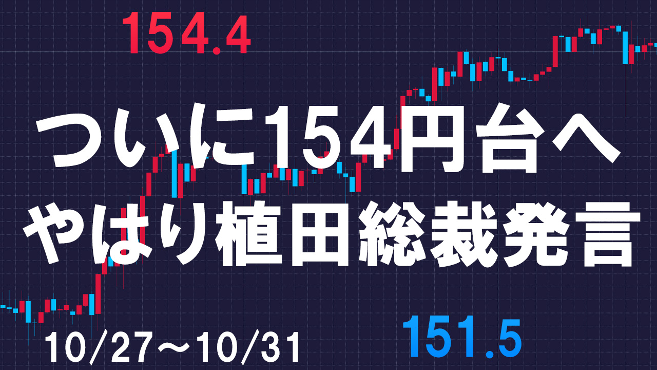 今週のドル円はいろいろなビッグイベントがありましたが、木曜の植田総裁の会見で次の利上げに関する言及が無かったことによって上昇し、ついに154.4円まで円売りが進行しました。