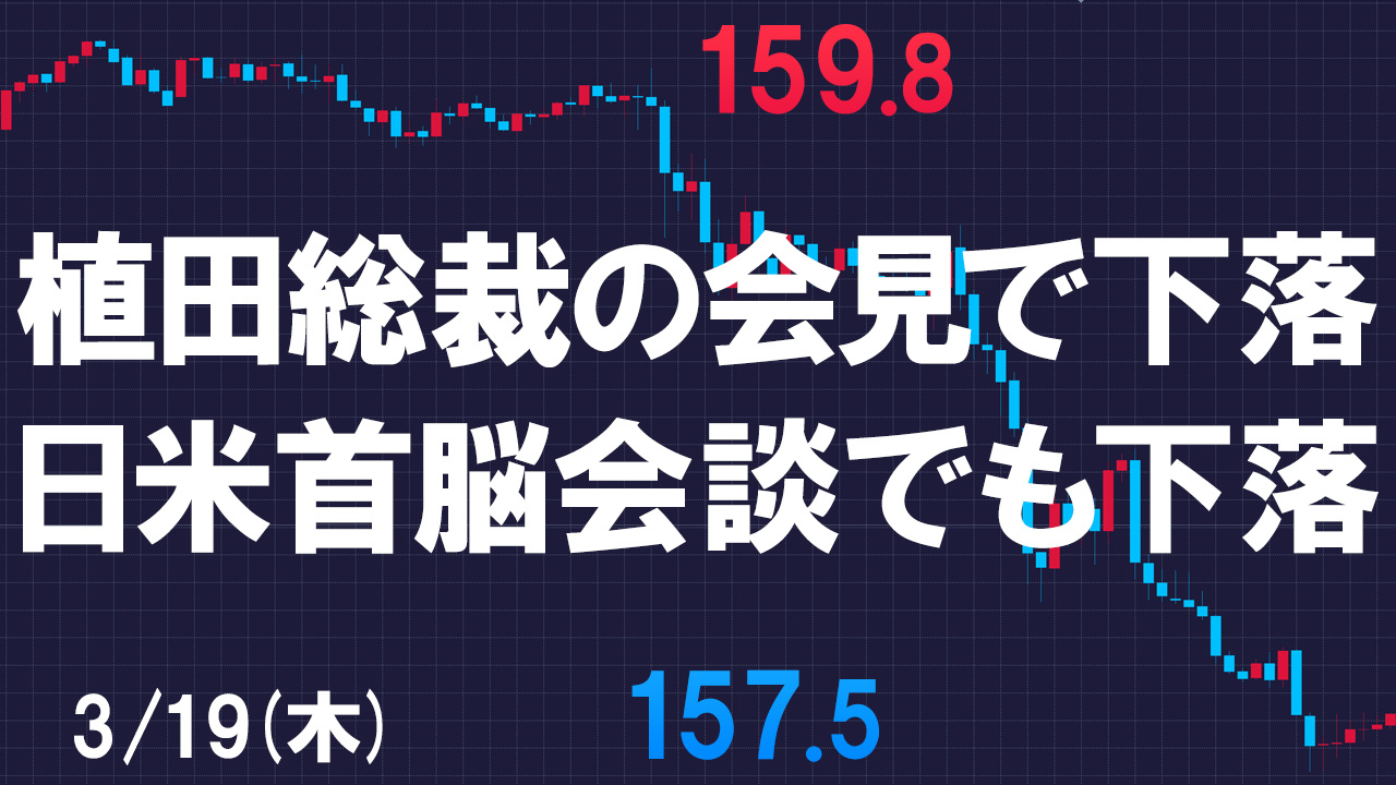 木曜のドル円は注目の植田総裁の会見を受けて下落し、そして日米首脳会談などでもさらに安値を攻めて157.5円まで下落していきました。